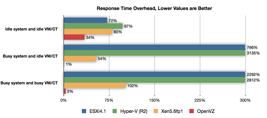 На графике времени отклика системы можно наблюдать результаты трех тестов — с нагрузкой на систему и виртуальную машину, без нагрузки, нагрузкой только на ВМ. Во всех тестах OpenVZ показал результаты наименьшего времени отклика, в то время, когда ESXi и Hyper-V показывают оверхед 700-3000%, когда у OpenVZ всего 1-3%.
