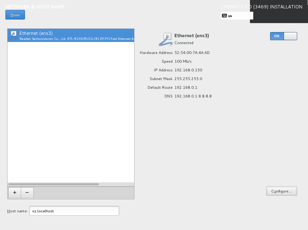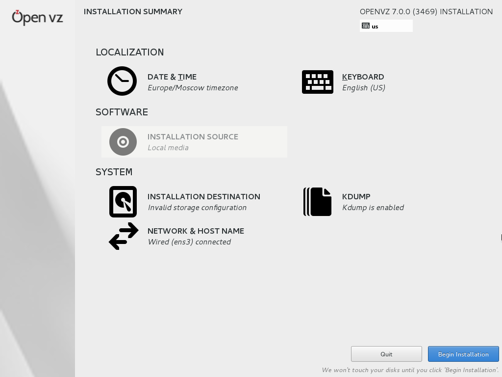 Установка OpenVZ ничем не отличается от установки обычного Linux-дистрибутива. Установщик Anaconda предложит установить дату и время, раскладку клавиатуры, языковые параметры. Также необходимо будет произвести разметку диска и настроить сеть. По умолчанию включен kdump, который позволяет в будущем выяснить причины сбоев в ядре, поэтому рекомендуется его не отключать.