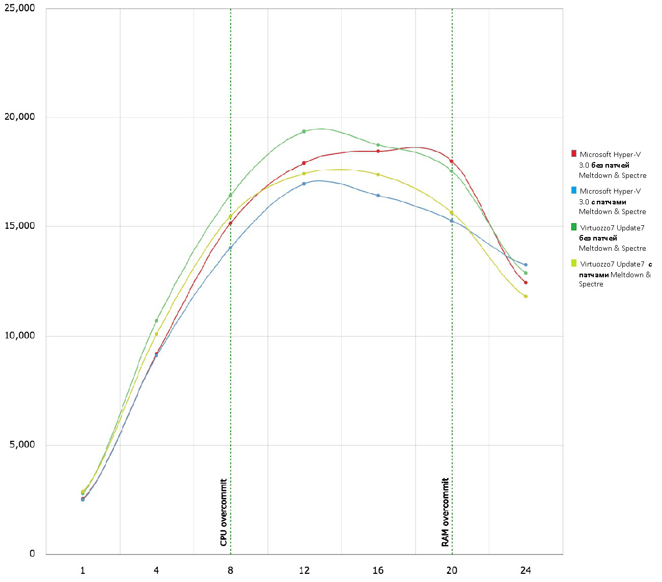Другое сравнение было проведено между Virtuozzo 7 и Hyper-V 3.0. Здесь производительность оценивалась с помощью теста vConsolidate, гостевая ОС — Windows Server 2012 R2.